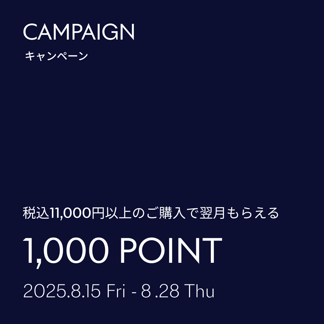 期間中税込11,000円以上ご購入いただいた方に、翌月使える1,000ポイントをプレゼント!!※CLUB DESCENTE 会員限定(当日新規ご登録いただいた方も対象)
