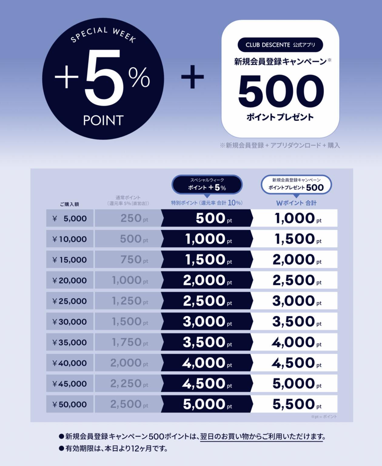 また、CLUB DESCENTEに新規会員登録いただくと翌日から使える500ポイントをプレゼント!