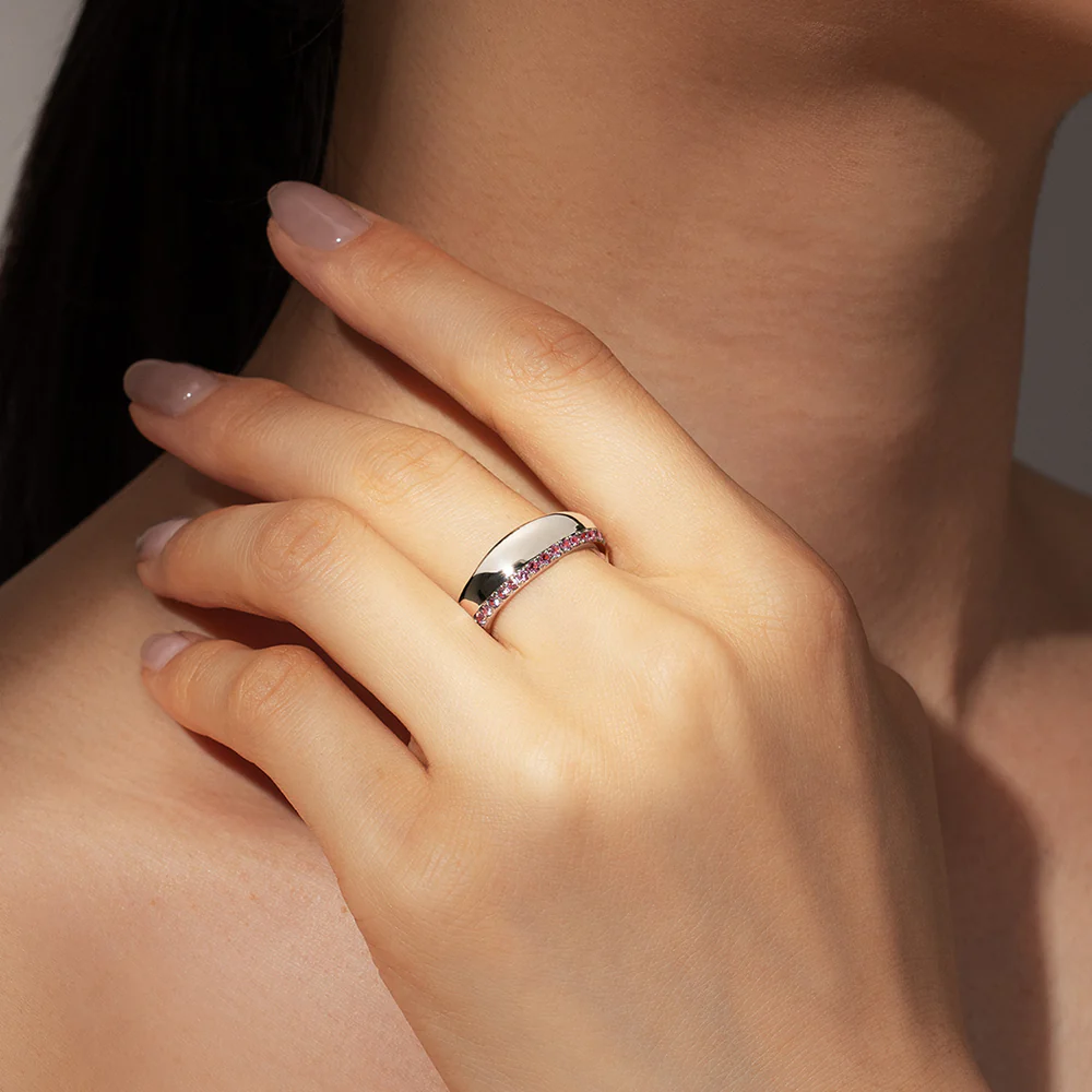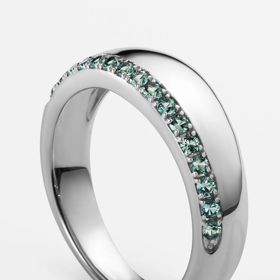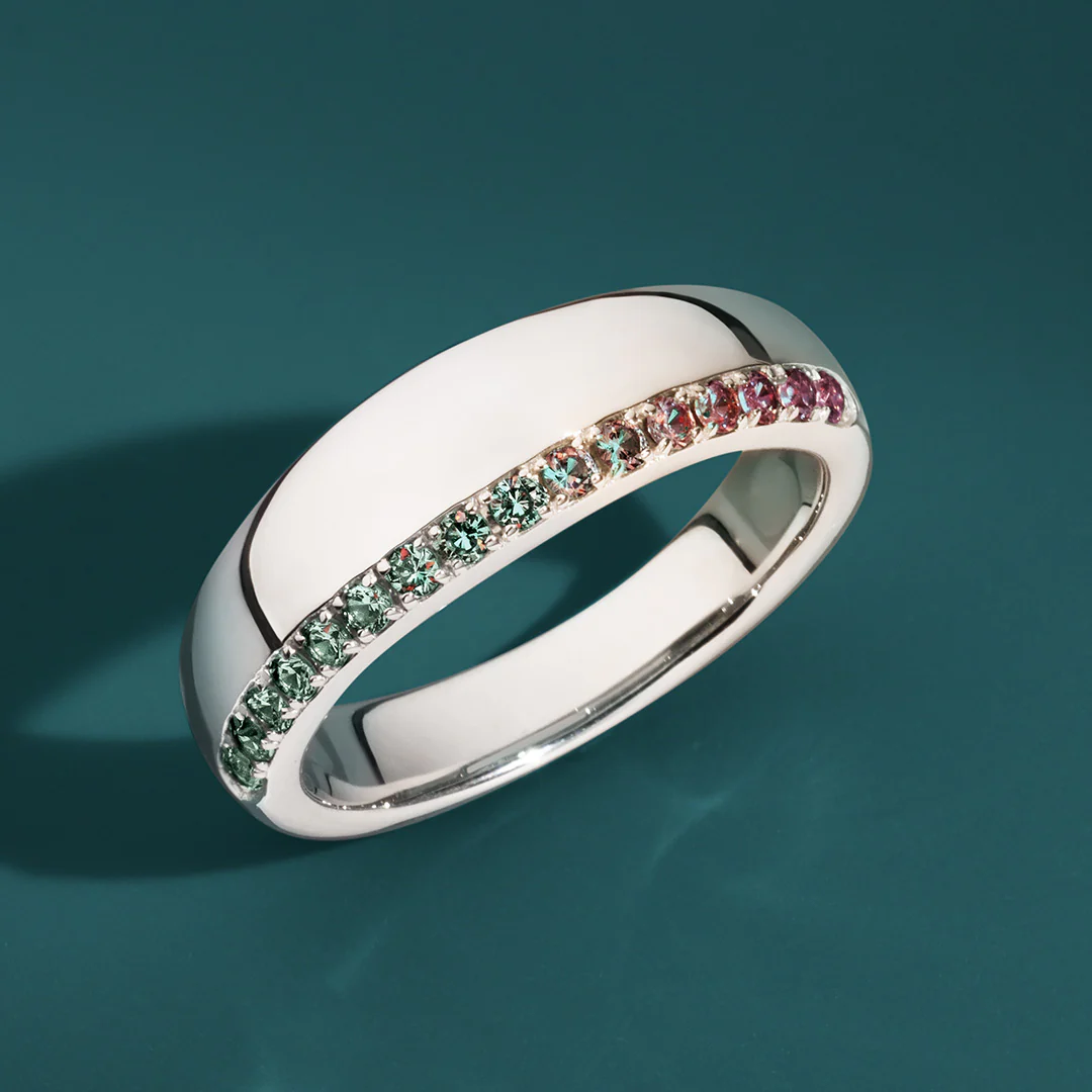 そんな希少石の原鉱石から生み出されたラボグロウンのルースを並べて、マニッシュな佇まいのリングが誕生しました。