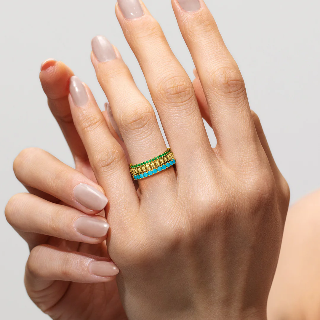 ビズーのエタニティリング「エマ」と合わせれば、まるで一本の指輪のように調和し、手元をより洗練された印象へと導きます。
