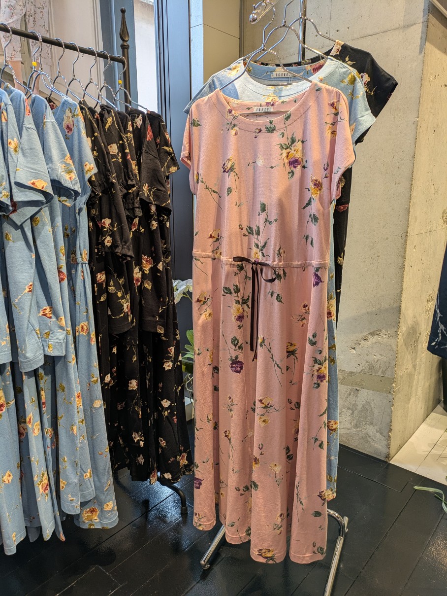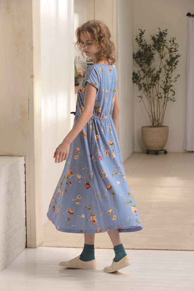 さらりとした肌触りのルームワンピースウエストの紐でシルエットを変化できAラインシルエットで着ていただけます