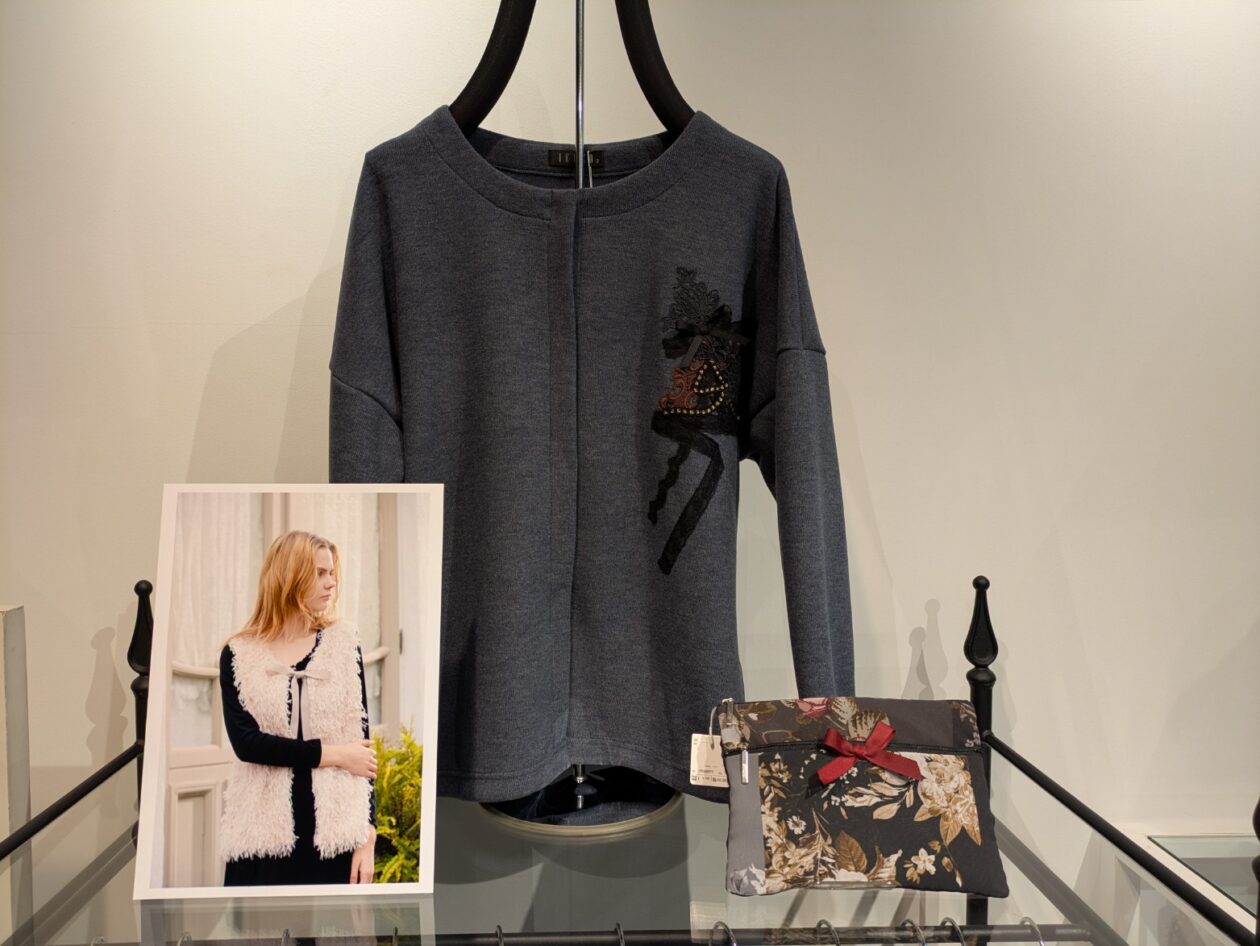 胸元のレースや刺繍が華やかなニット生地の羽織物