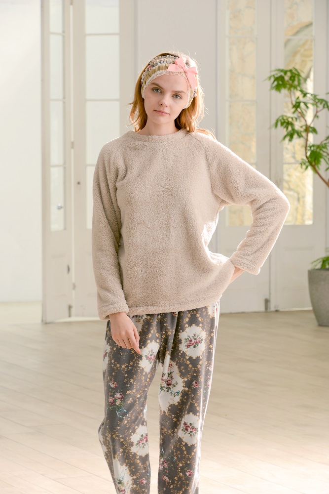トップスがシープボアでパンツは綾ネルのルームウエアーを兼ねたパジャマです温かく軽さのあるシープボアは寒い時期にお薦めです