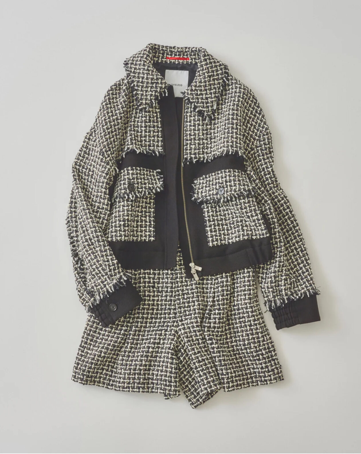 たっぷりとあしらわれたフリンジが目を惹く、華やかでエッジィなジップブルゾン。バスト下で異素材に切り替えた立体的なデザインが、メリハリのあるシルエットを実現します。ショートパンツとのセットアップの着こなしも可能に。