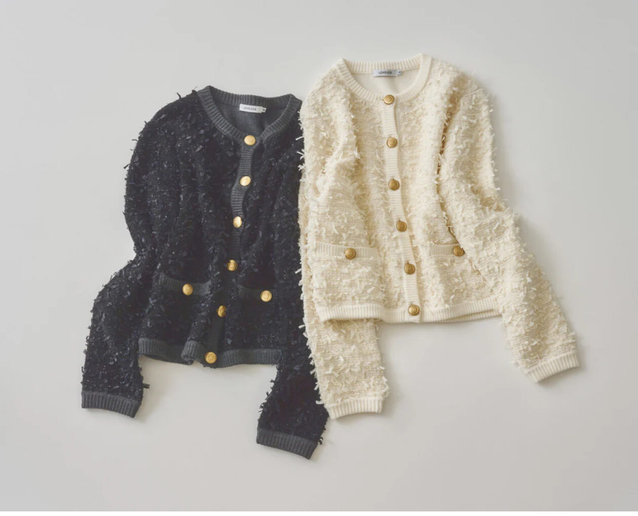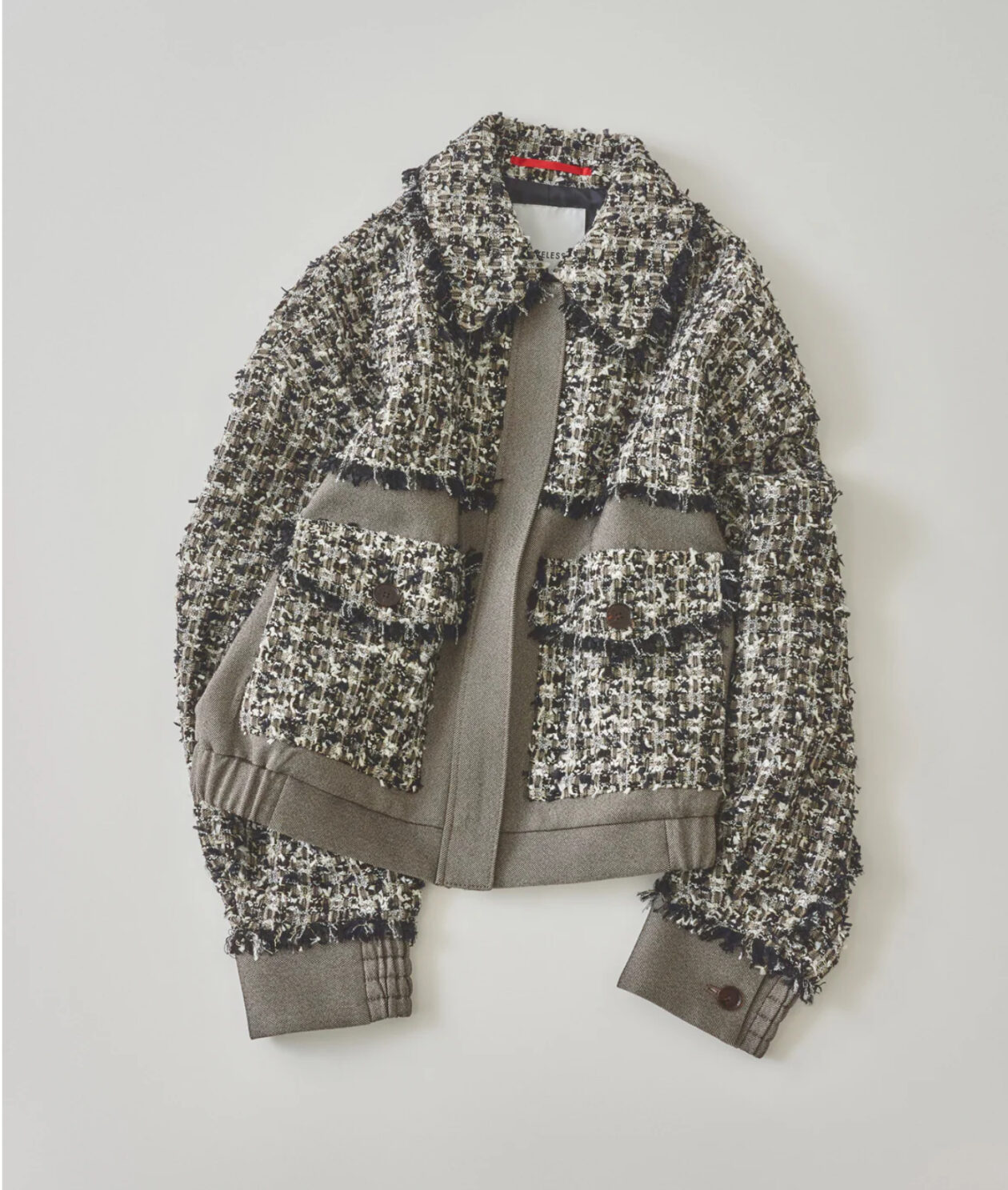 ツイードとコンビになった存在感のあるニットカーディガン。ツィードのクラシカルな表情とニットの柔らかさが調和し、リュクスな印象に。