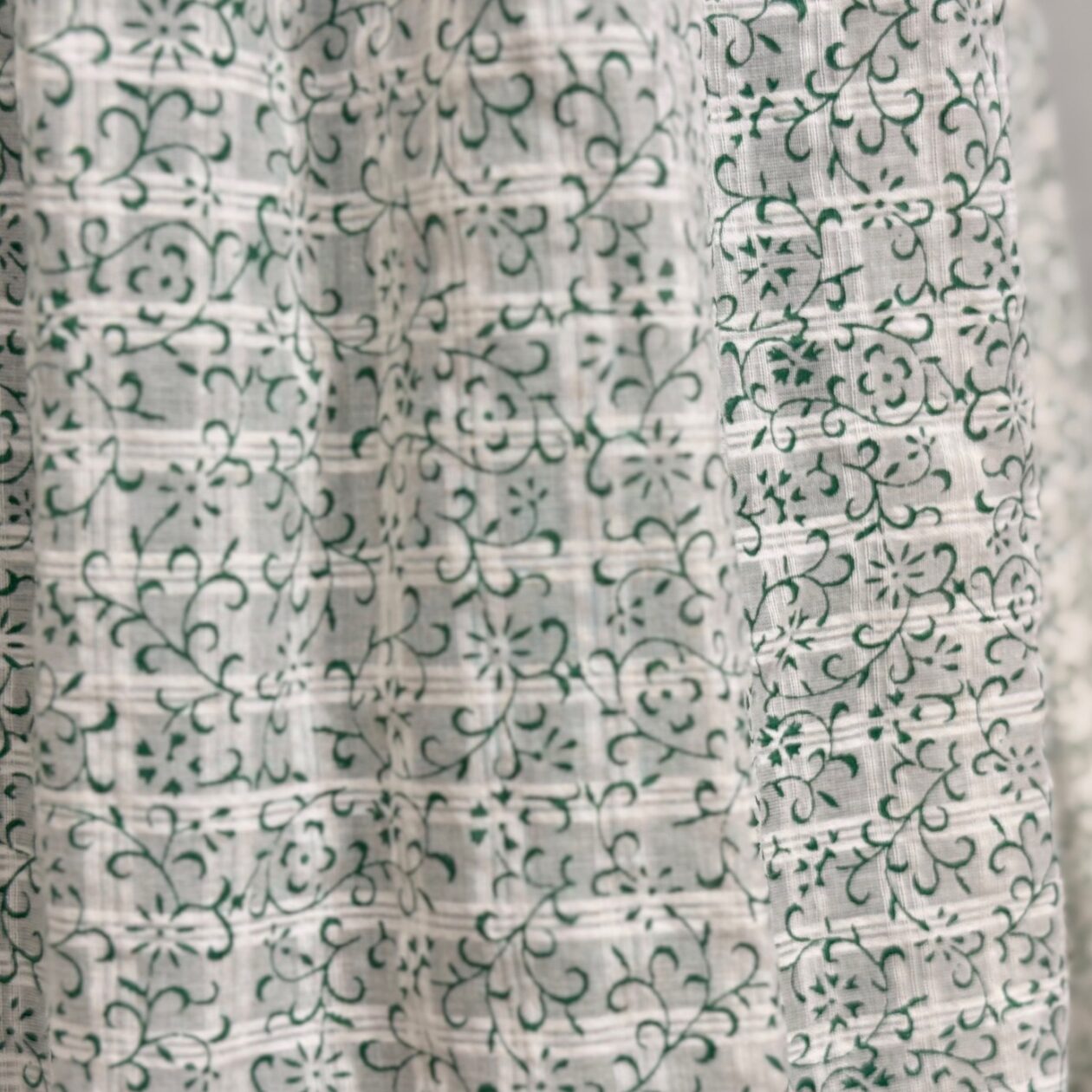 透け感のある大柄のドビーチェック生地の上から、オリジナルのアラベスク柄をプリント。