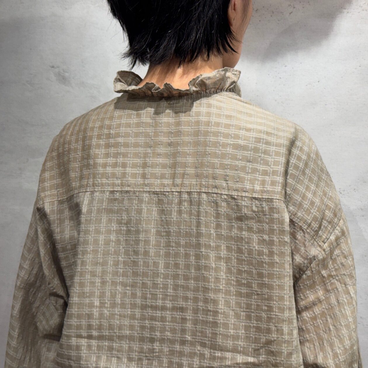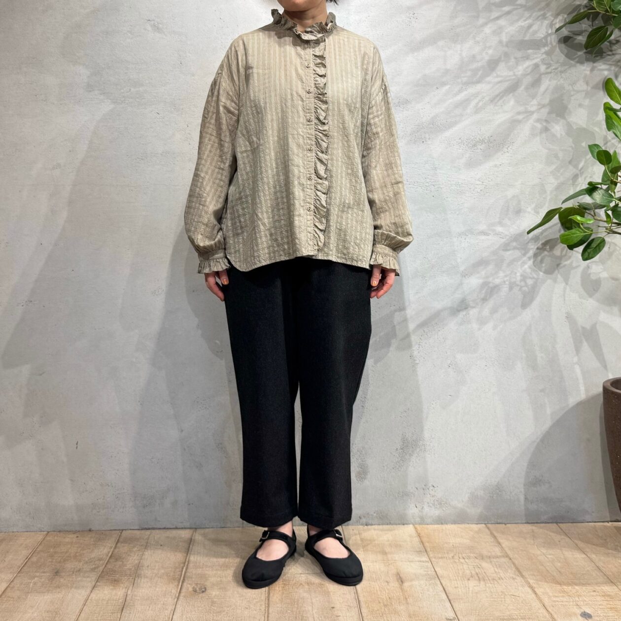 共生地でフリルをあしらったシャツは、ドロップショルダーやゆとりあるシルエットで程よくラフさをプラスし、甘過ぎない雰囲気に仕上げました!!
