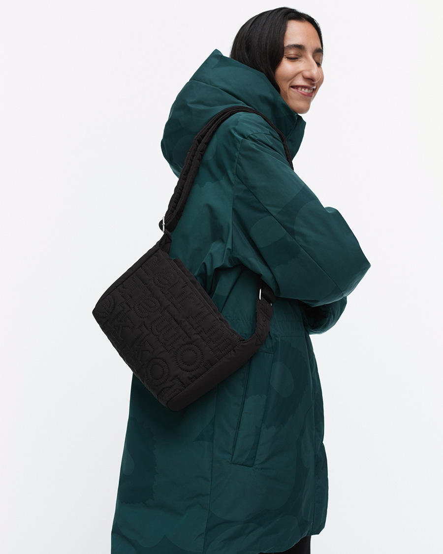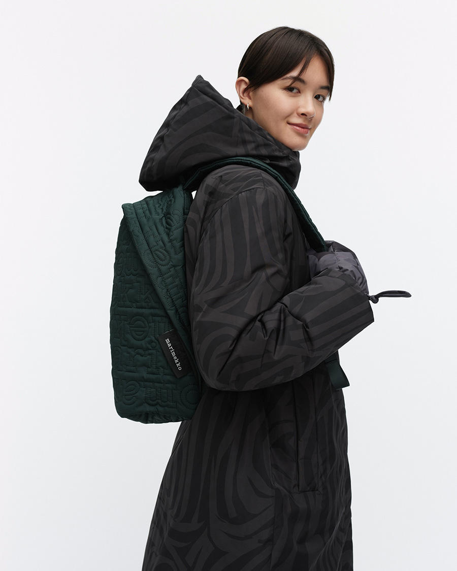 洗練されたブラックとダークグリーンの色合い、そして象徴的なマリメッコのロゴパターンが特徴です。