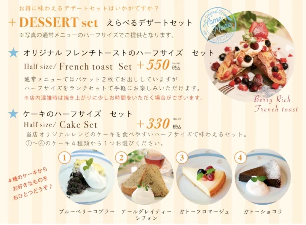 当店オリジナルレシピの人気フレンチトーストや、ケーキを食べやすいハーフSizeで味わえるセットです。