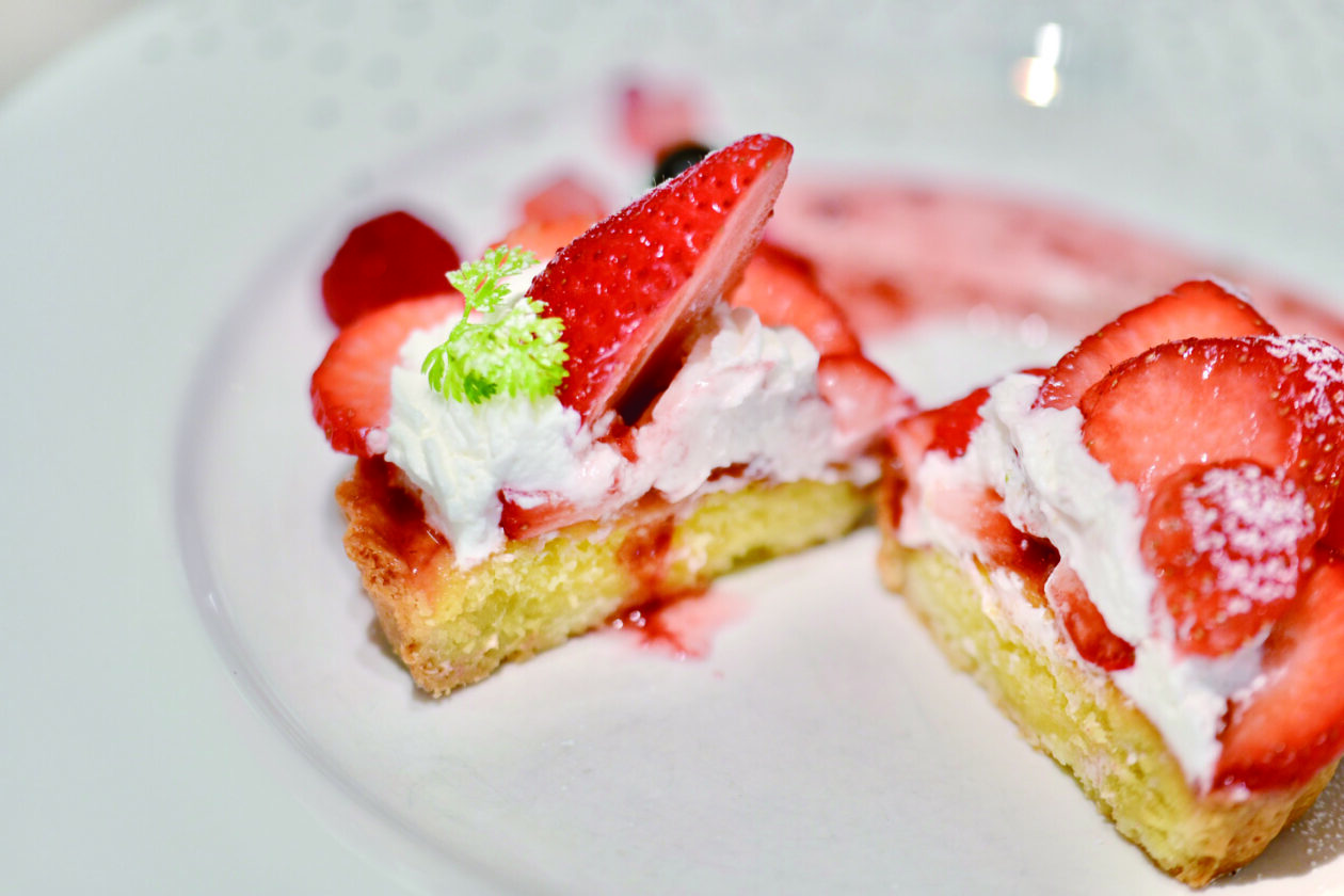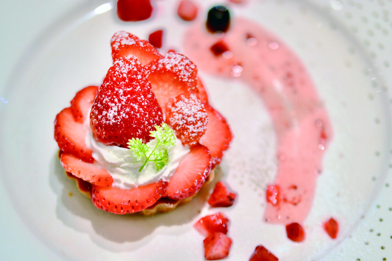 サクッと焼き上げた香ばしいタルトとたっぷりの生クリームベリーソースがいちごの甘酸っぱさをより引き立てます。