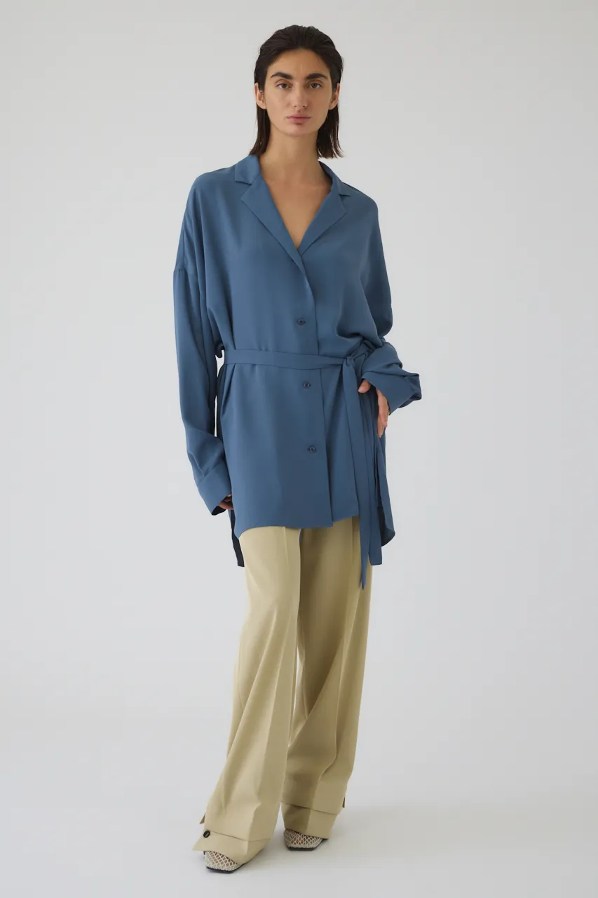 オープンカラーがデコルテをきれいに見せてくれるので、華奢なジュエリーを合わせたり、フロントを開けて羽織りとして着用したりと、幅広いスタイリングが楽しめます。