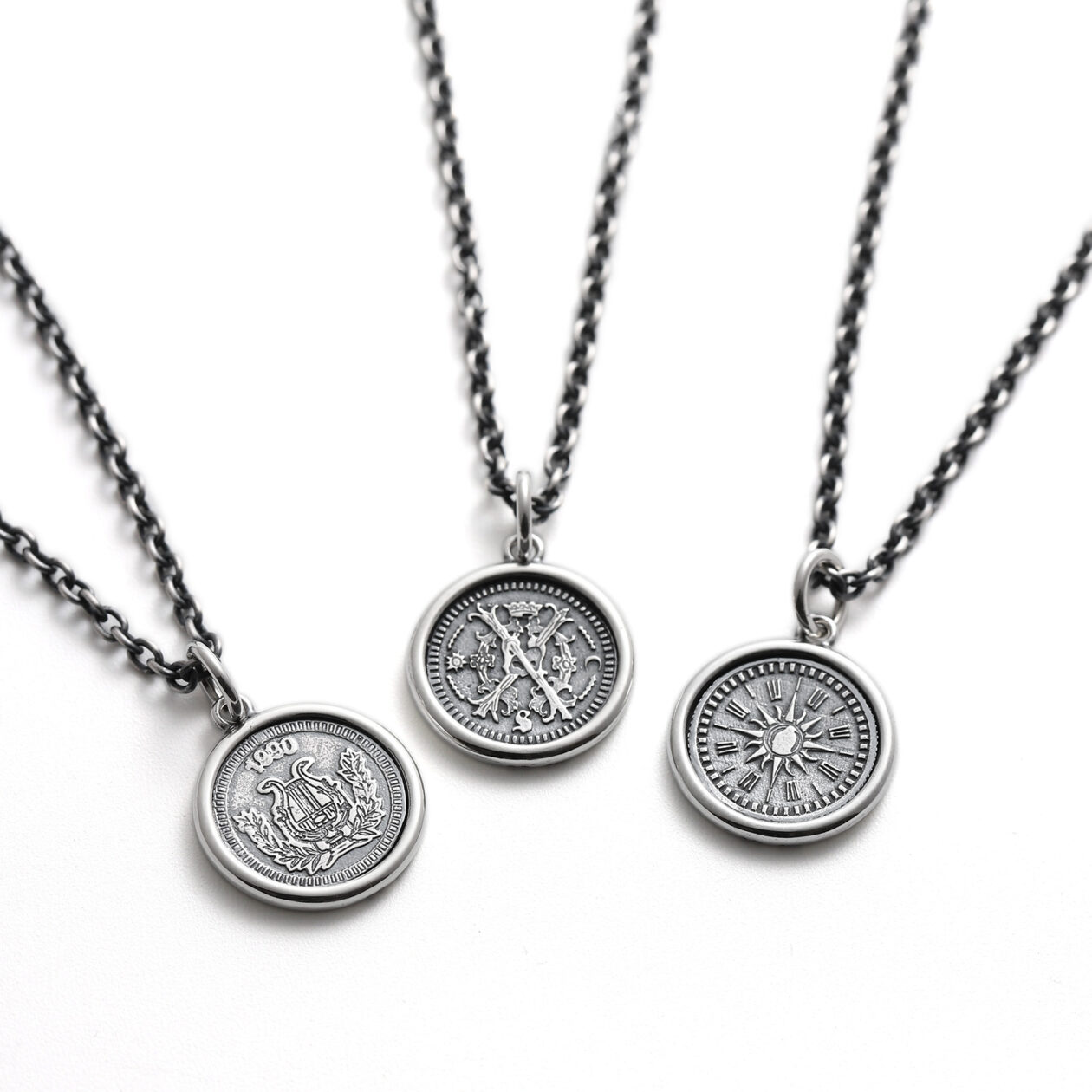 燻し加工によってヴィンテージな雰囲気を纏い、装いも新たに登場する3種のコインネックレスには、ギリシャ神話の神々からインスピレーションを受けたブランドの願いを宿しています。