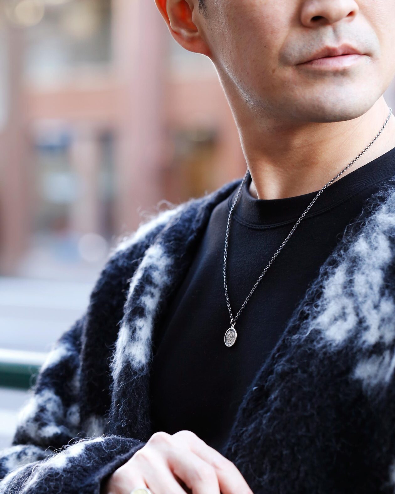 また、こちらの新作でシンパシーオブソウルがひそかに提案するのは、チェーンの長さを55cmに設定するという新しい選択。50cmが定番である一方で、5cm伸ばし顔からペンダントトップの位置を離すことによって、控えめな存在感と少しだけ肩の力が抜けるようなルーズ感を実現させています。