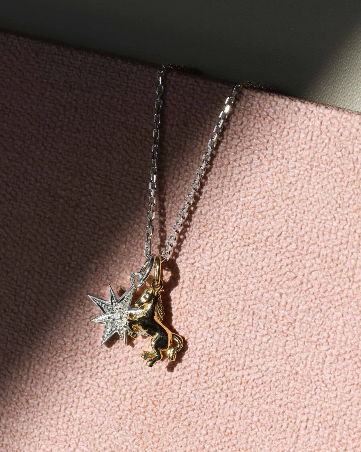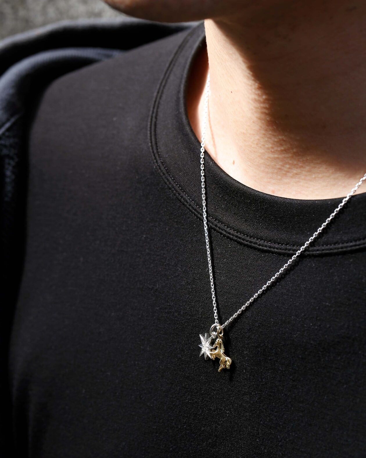 躍動感あふれる跳ね馬モチーフのペンダント。そこに重ねたのは、夜空に瞬く星と太陽の力強さを表現した【サンスターペンダント】です。