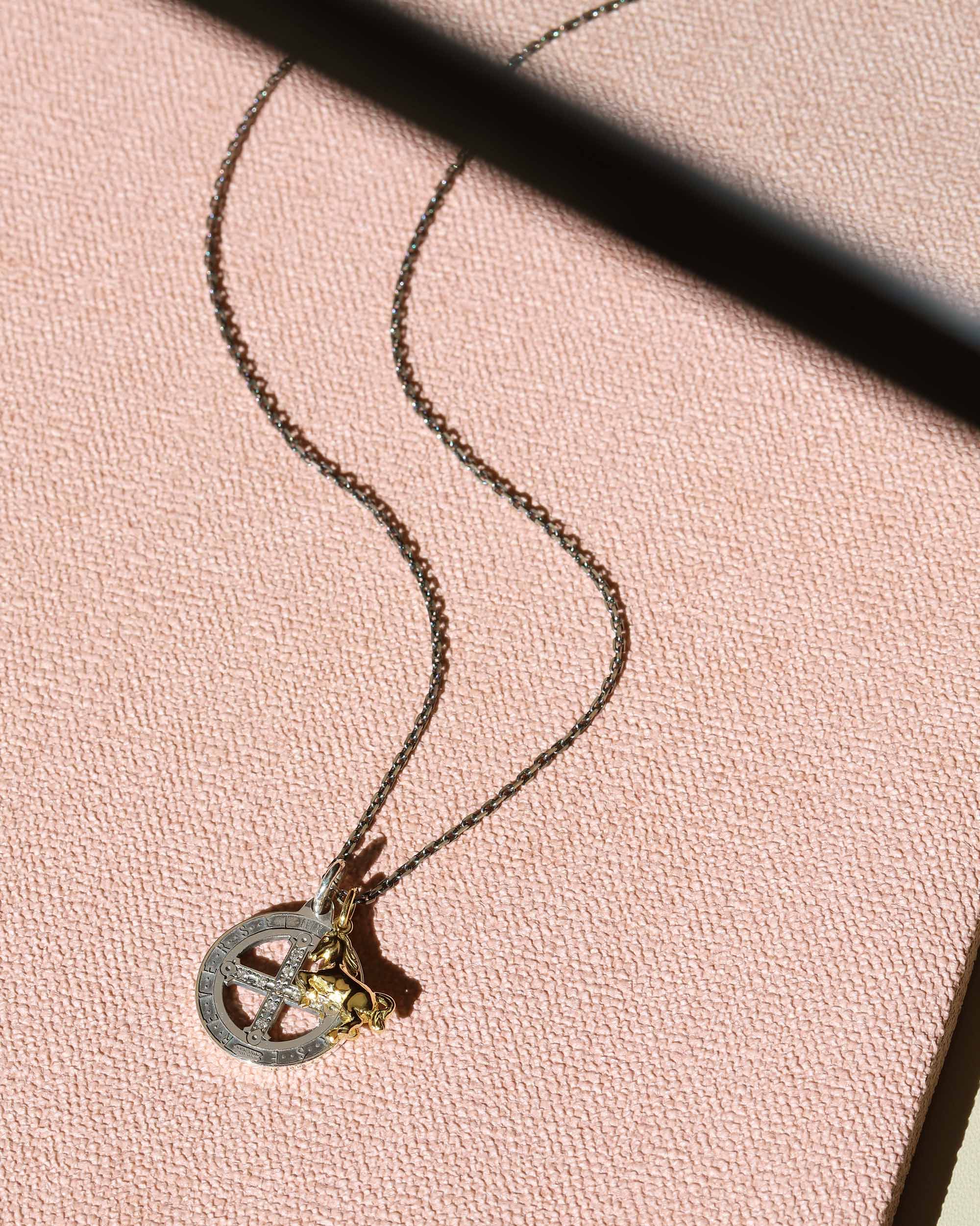 立体的な馬モチーフに、平面的なコイン型ペンダントを重ねることで、自然に収まりの良い調和が生まれます。こちらは【クロスメダルネックレス】を用いたコーディネート。