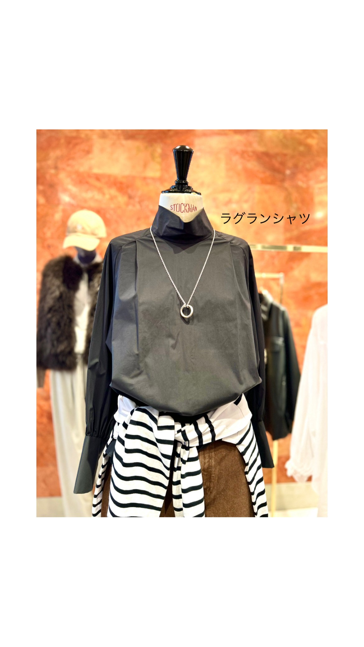 立体感と表情を生み出しているデザインが映えるハイネックのラグランシャツ。